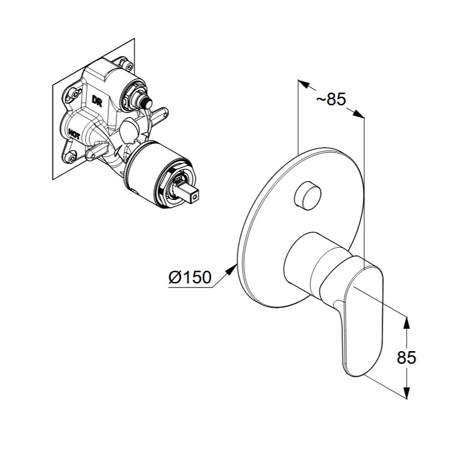 Dane techniczne: - średnica rozety: 150 mm - przepływ wody 28 l/min przy ciśnieniu 3 bar (wyjście dolne) - przepływ wody24 l/min przy ciśnieniu 3 bar (wyjście górne)