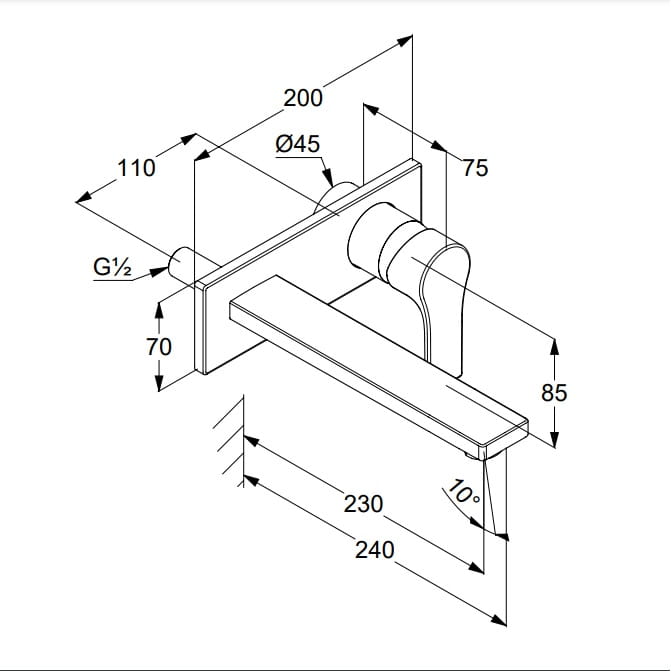 Dane techniczne: - zasięg wylewki: 230 mm - długość wylewki: 240 mm - średnica przyłącza 1/2" - szerokość rozety: 200 mm - wysokość rozety: 70 mm - przepływ wody 7 l/min przy ciśnieniu 3 bar