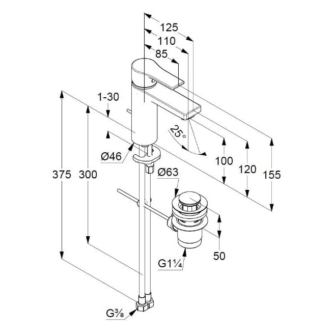 Dane techniczne: - wysokość baterii: 155 mm - zasięg wylewki: 110 mm - średnica przyłącza: G 3/8