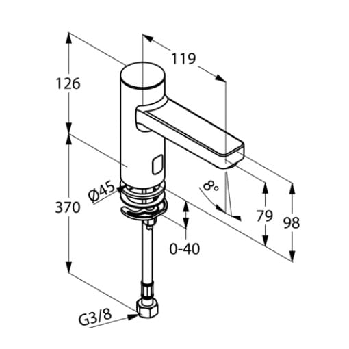 Dane techniczne: - zasięg wylewki: 119 mm - wysokość korpusu:126 mm - przepływ wody 4,8 l/min przy ciśnieniu 3bar - PCA perlator kaskadowy M 24 x 1 - bateria alkaliczna 6V