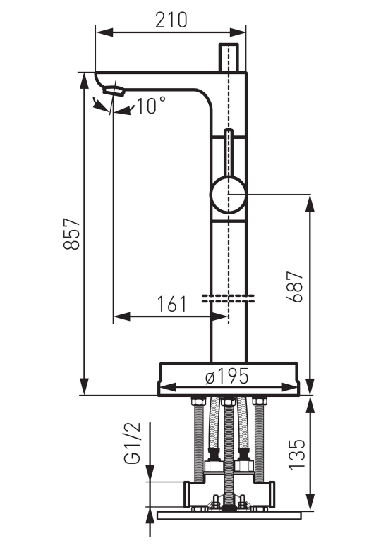 Dane techniczne: - zasięg wylewki: 161 mm - średnica przyłącza: 1/2" - średnica rozety: 195 mm - wysokość baterii: 857 mm - minimalna grubość podbudowy: 135 mm - długość węża natrysku: 1500 mm