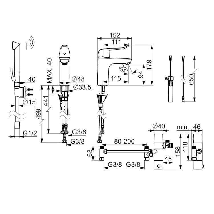 Dane techniczne: - głowica ceramiczna: 40 mm - zasięg wylewki: 115 mm - wysokość baterii: 179 mm - długość baterii: 152 mm - długość węża: 1750 mm - podłączenie elektryczne: 9 V - przepływ wody dla 300 kPa: 0.09 l/s - spadek ciśnienia dla przepływu (0.1 l/s): 300 kPa