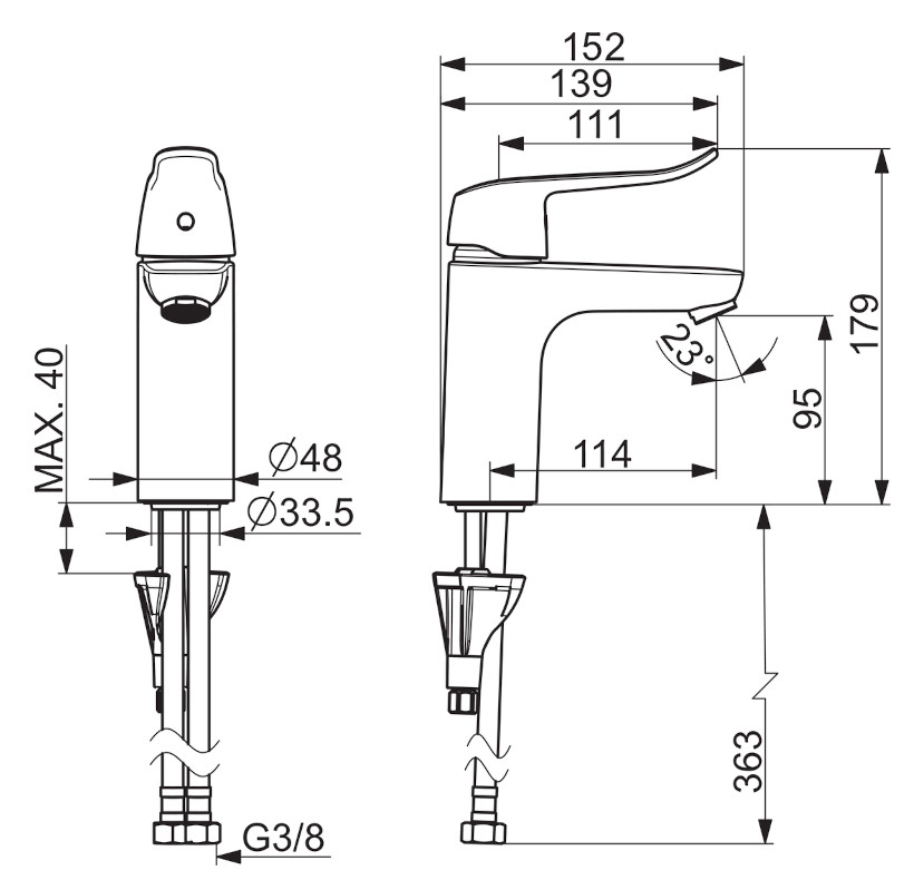 Dane techniczne: - przepływ wody: 0,18L/s - zasięg wylewki: 114 mm - średnica głowicy: 40 mm - średnica przyłączy: 3/8" - wysokość baterii: 179 mm - ciśnienie robocze: 50-1000 kPa - woda ciepła zasilająca max: 70 stopni C