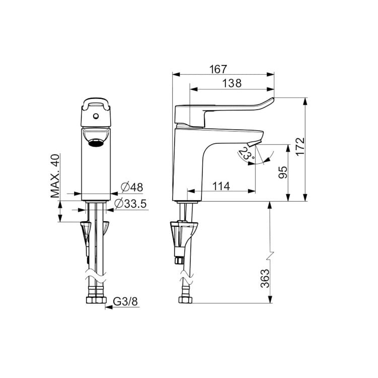 Dane techniczne: - głowica ceramiczna: 40 mm - zasięg wylewki: 114 mm - wysokość baterii: 172 mm - długość baterii: 167 mm