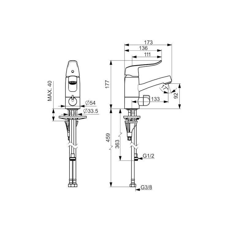 Dane techniczne: - głowica ceramiczna: 40 mm - zasięg wylewki: 133 mm - wysokość baterii: 177 mm - długość baterii: 173 mm