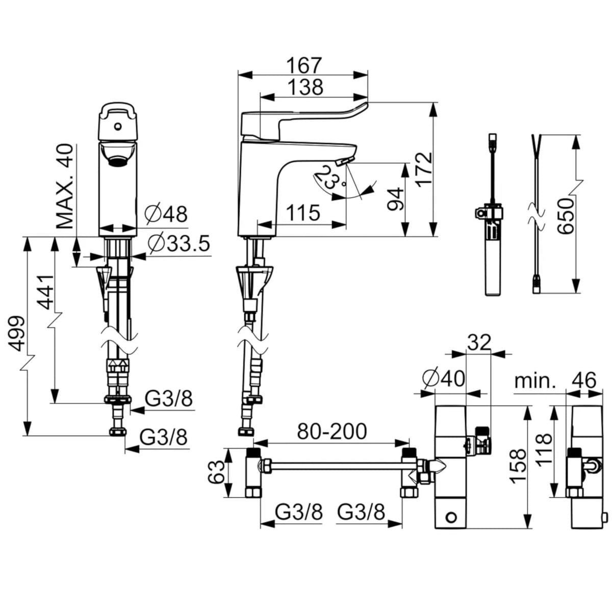 Dane techniczne: - zasięg wylewki: 115 mm - długość baterii: 167 mm - wysokość baterii: 172 mm - ceramiczna głowica 40 mm do ustawiania przepływu i temperatury