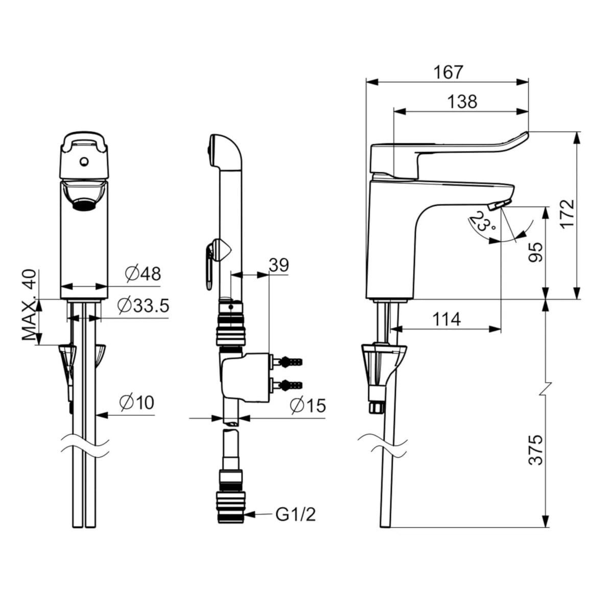 Dane techniczne: - długość baterii: 167 mm - wysokość baterii: 172 mm - wąż natrysku 1500 mm - ceramiczna głowica 40 mm do ustawiania przepływu i temperatury