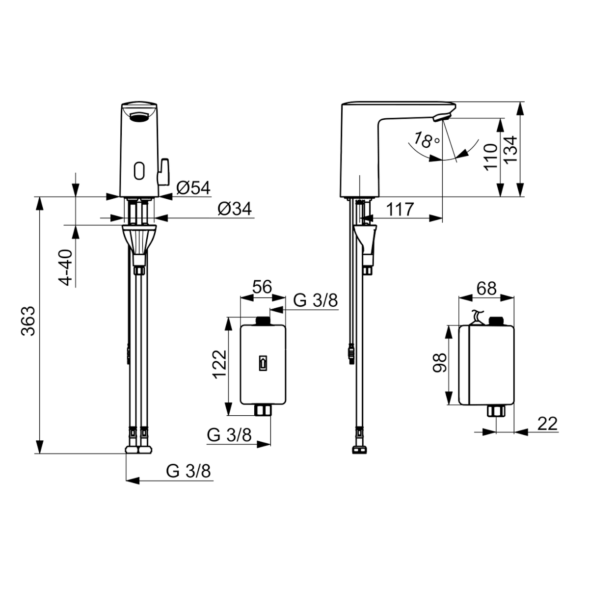 Dane techniczne: - wysokość baterii: 134 mm - zasięg wylewki: 117 mm - przyłącze: G 3/8 - natężenie przepływu przy 300 kPa (Z regulatorem): 0.08 l/s - spadek ciśnienia dla przepływu (0.1 l/s): 470 kPa