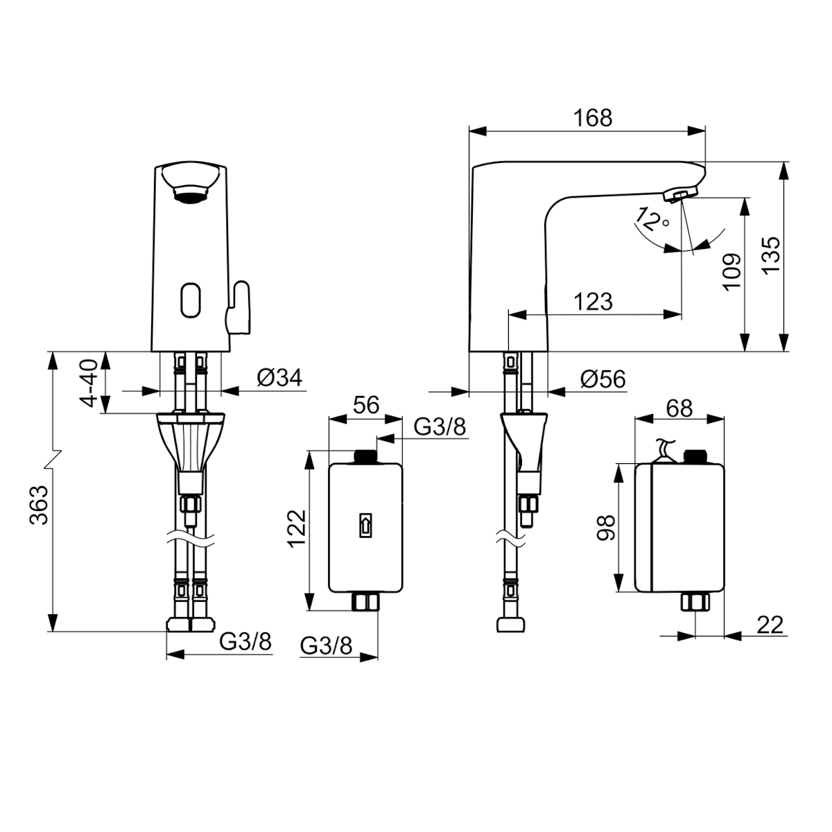 Dane techniczne: - wysokość baterii: 135 mm - zasięg wylewki: 123 mm - przyłącze: G 3/8 - natężenie przepływu przy 300 kPa (Z regulatorem): 0.09 l/s - spadek ciśnienia dla przepływu (0.1 l/s): 375 kPa