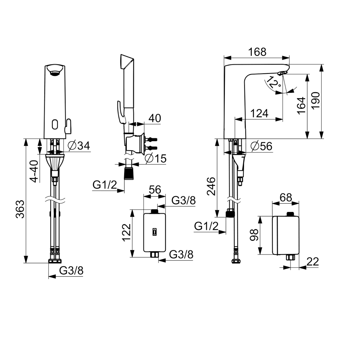 Dane techniczne: - wysokość baterii: 190 mm - zasięg wylewki: 124 mm - przyłącze: G 3/8 - natężenie przepływu przy 300 kPa (Z regulatorem): 0.08 l/s - spadek ciśnienia dla przepływu (0.1 l/s): 470 kPa