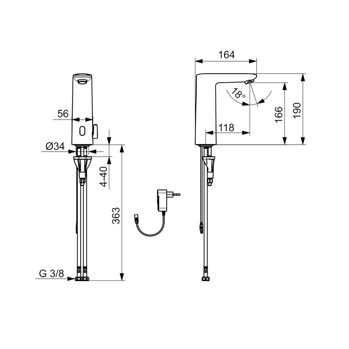 Dane techniczne: - wysokość baterii: 190 mm - zasięg wylewki: 118 mm - przyłącze: G 3/8 - natężenie przepływu przy 300 kPa (Z regulatorem): 0.1 l/s - spadek ciśnienia dla przepływu (0.1 l/s): 300 kPa