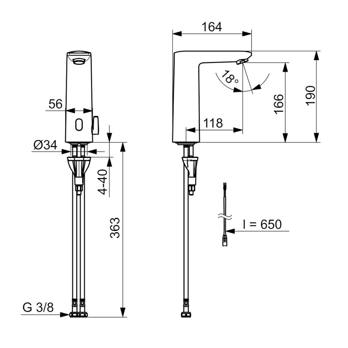 Dane techniczne: - wysokość baterii: 190 mm - zasięg wylewki: 118 mm - przyłącze: G 3/8 - natężenie przepływu przy 300 kPa (Z regulatorem): 0.1 l/s - spadek ciśnienia dla przepływu (0.1 l/s): 300 kPa