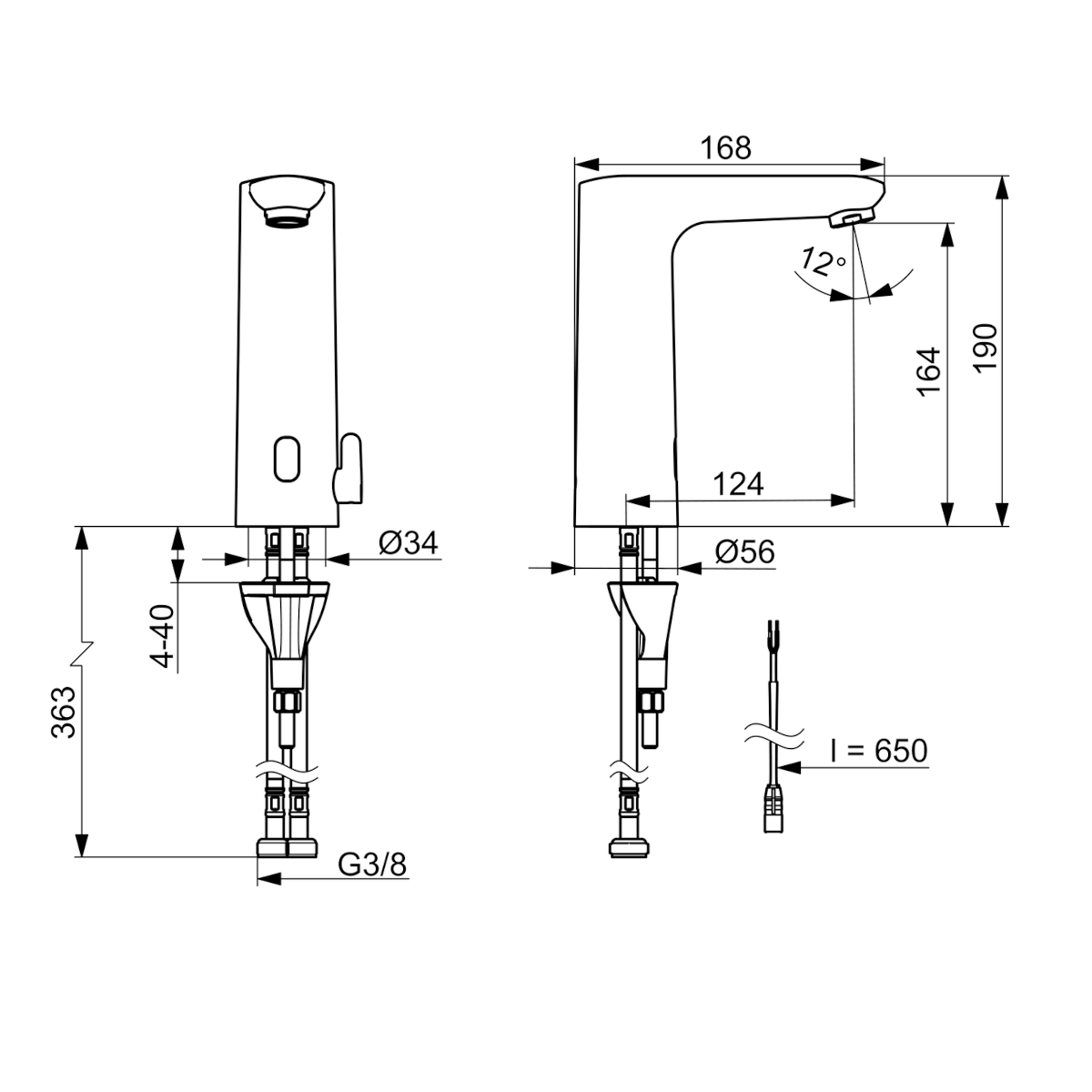 Dane techniczne: - wysokość baterii: 190 mm - zasięg wylewki: 124 mm - przyłącze: G 3/8 - natężenie przepływu przy 300 kPa (Z regulatorem): 0.1 l/s - spadek ciśnienia dla przepływu (0.1 l/s): 300 kPa