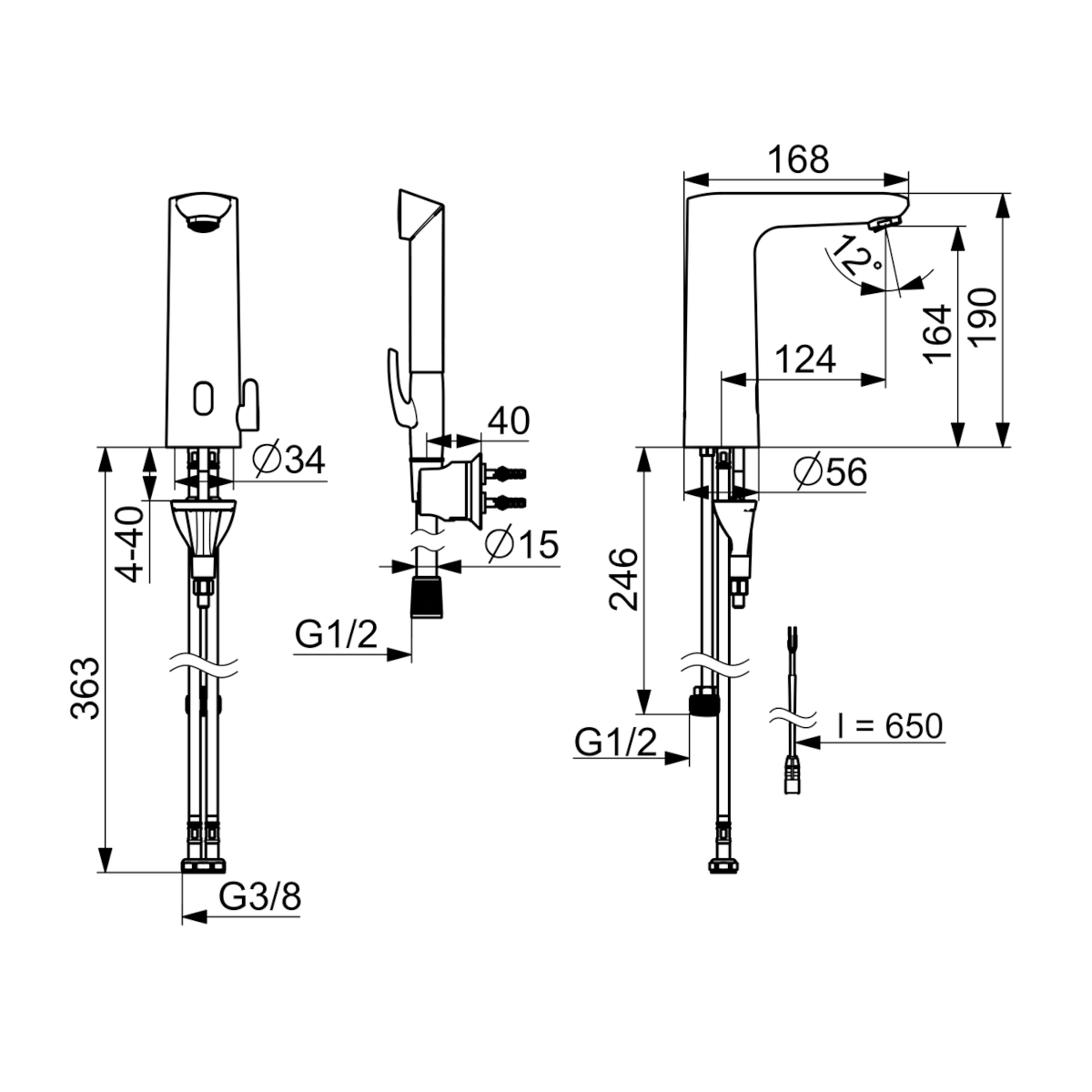 Dane techniczne: - wysokość baterii: 190 mm - zasięg wylewki: 124 mm - długość węża: 1500 mm - przyłącze: G 3/8 - natężenie przepływu przy 300 kPa (Z regulatorem): 0.09 l/s - spadek ciśnienia dla przepływu (0.1 l/s): 375 kPa