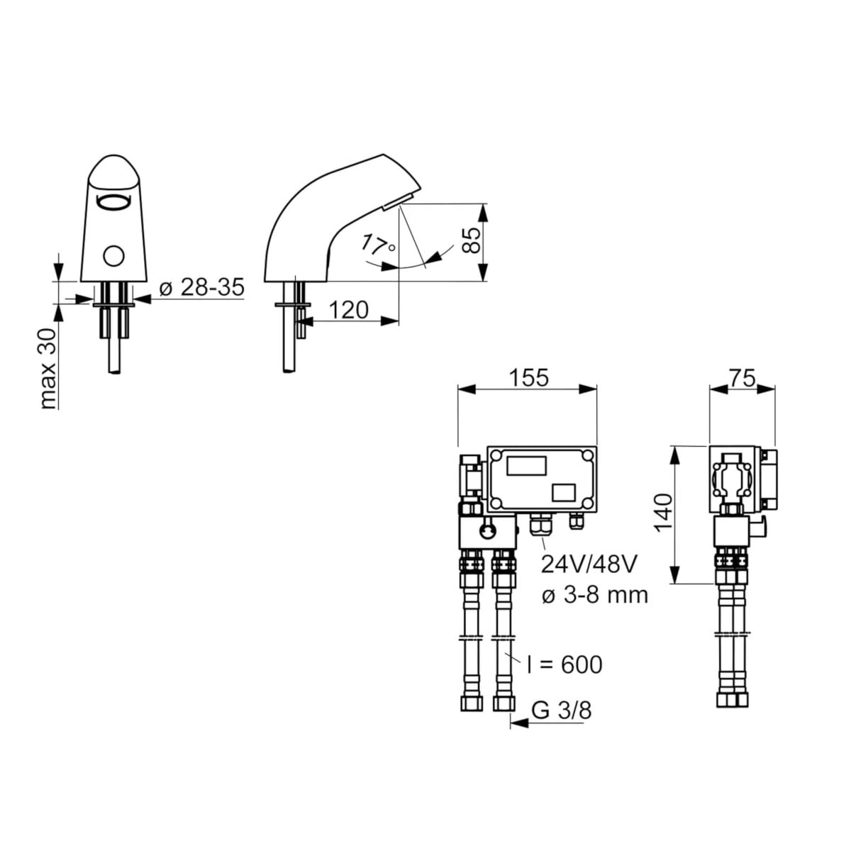 Dane techniczne: - zasięg wylewki: 120 mm - wysokość do perlatora: 85 mm - opóźnienie zamknięcia: 3 s (1-20 s) - automatyczne płukanie off (off/1-120 h) - cykl automatycznego płukania: 30 s (1-1800 s) - max czas przepływu 2 min (1 - 1800 s) - bluetooth version 5.x (D060577) - podłączenie elektryczne 24-48V