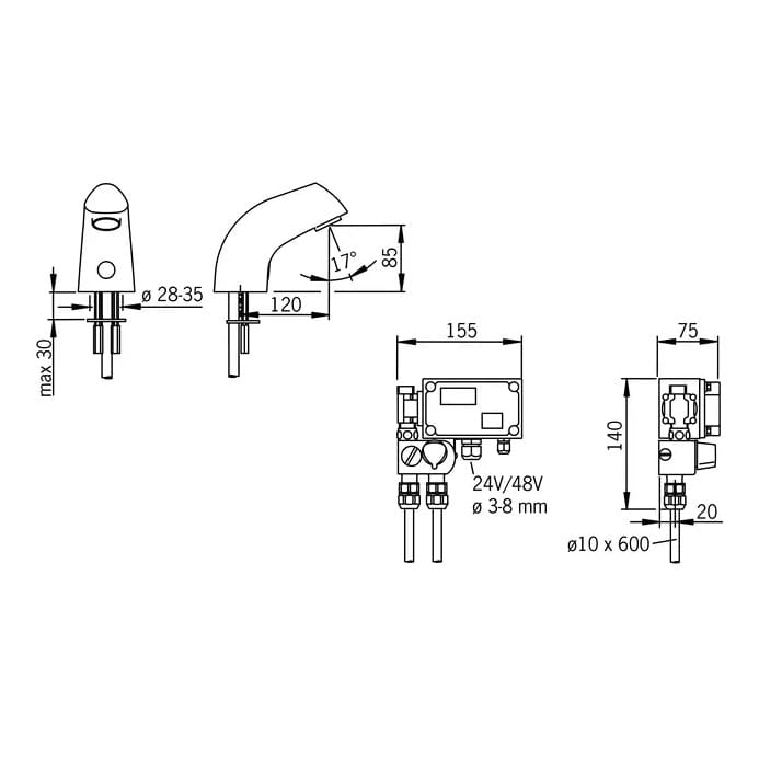 Dane techniczne: - zasięg wylewki: 120 mm - wysokość do perlatora: 85 mm - opóźnienie zamknięcia: 3 s (1-20 s) - automatyczne płukanie: off (off/1-120 h) - cykl automatycznego płukania: 30 s (1-1800 s) - max czas przepływu: 2 min (1 - 1800 s) - bluetooth version 5.x (D060577) - podłączenie elektryczne 24-48V