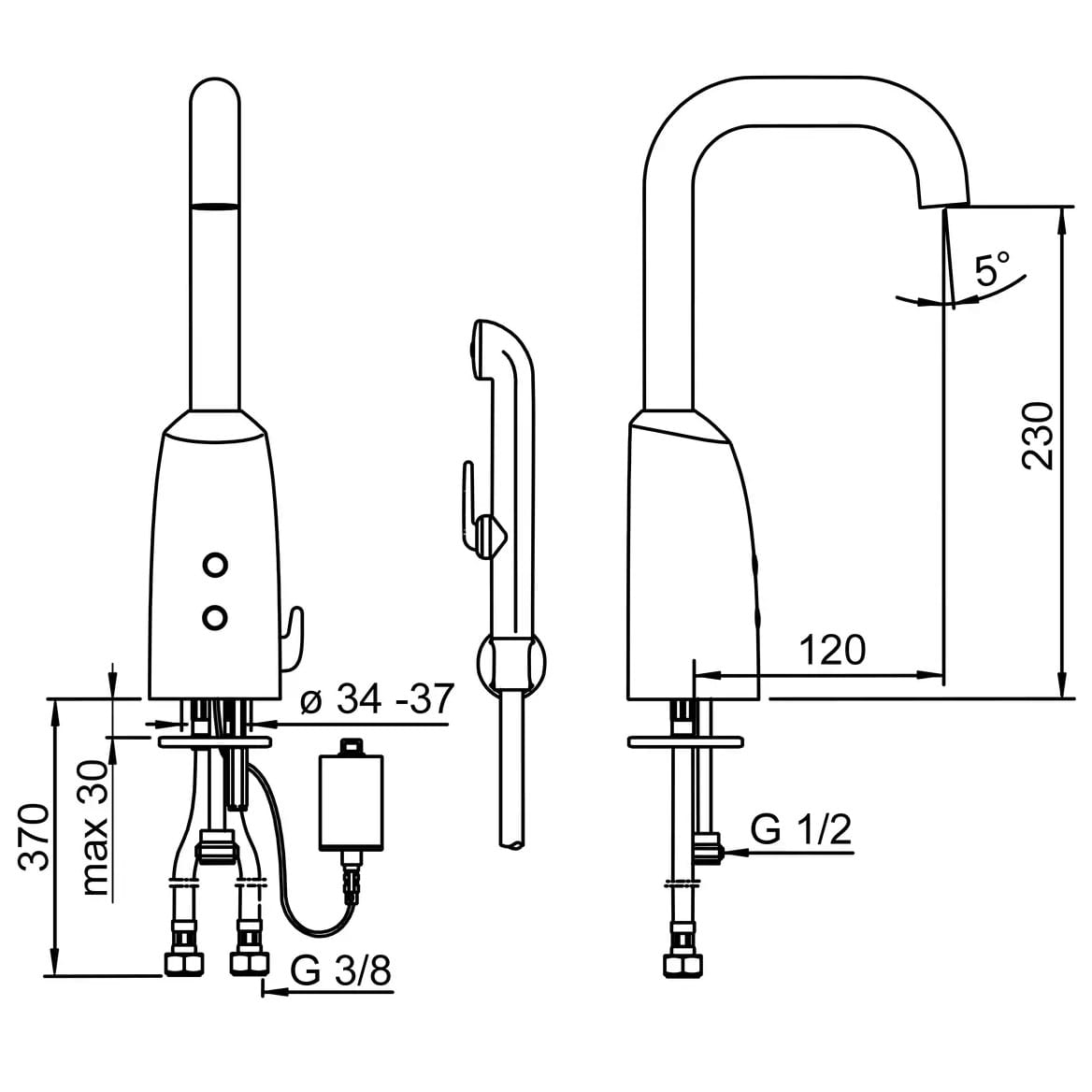 Dane techniczne: - zasięg wylewki: 120 mm - wysokość baterii do perlatora: 230 mm - wąż natrysku: 1500 mm - opóźnienie zamknięcia 3 s (1-20 s) - automatyczne płukanie off (off/1-120 h) - cykl automatycznego płukania 30 s (1-1800 s) - max czas przepływu 2 min (1 - 1800 s) - bateria Lithium 2CR5 6 V - bluetooth version 4.x (D034445)