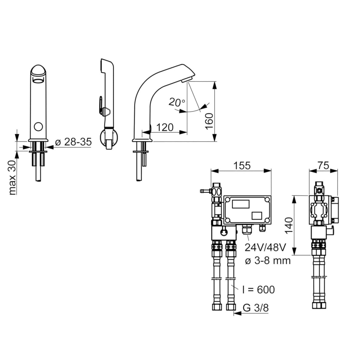 Dane techniczne: - wąż natrysku: 1500 mm - zasięg wylewki: 120 mm - wysokość baterii do perlatora: 160 mm - opóźnienie zamknięcia 3 s (1-20 s) - automatyczne płukanie off (off/1-120 h) - cykl automatycznego płukania 30 s (1-1800 s) - max czas przepływu 2 min (1 - 1800 s) - bluetooth version 5.x (D060577) - podłączenie elektryczne 24-48V