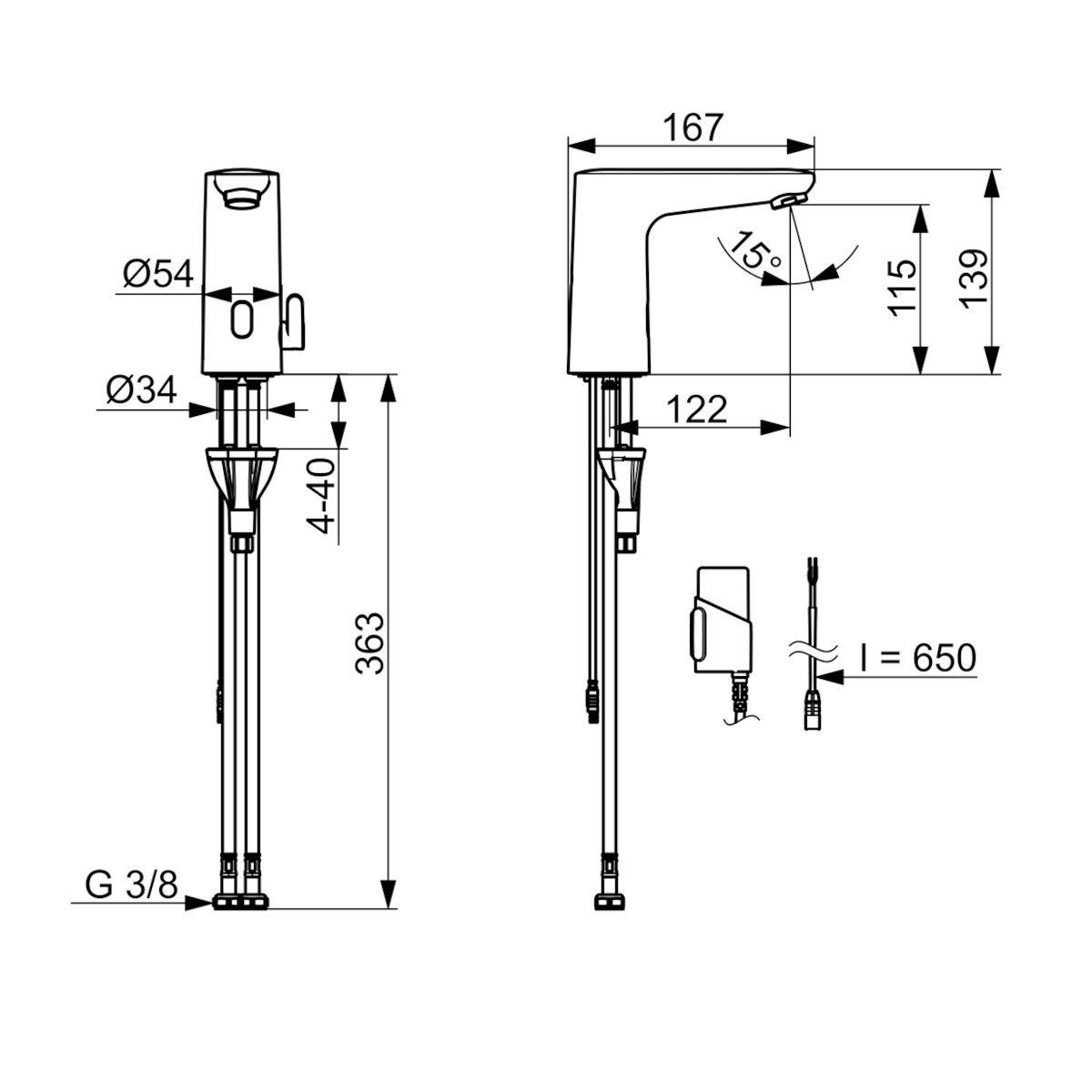 Dane techniczne: - wysokość baterii: 139 mm - zasięg wylewki: 122 mm - przyłącze: G 3/8 - natężenie przepływu przy 300 kPa (Z regulatorem): 0.1 l/s - spadek ciśnienia dla przepływu (0.1 l/s): 300 kPa