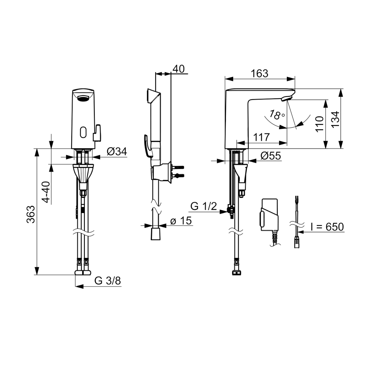 Dane techniczne: - wysokość baterii: 134 mm - zasięg wylewki: 117 mm - długość węża: 1500 mm - przyłącze: G 3/8