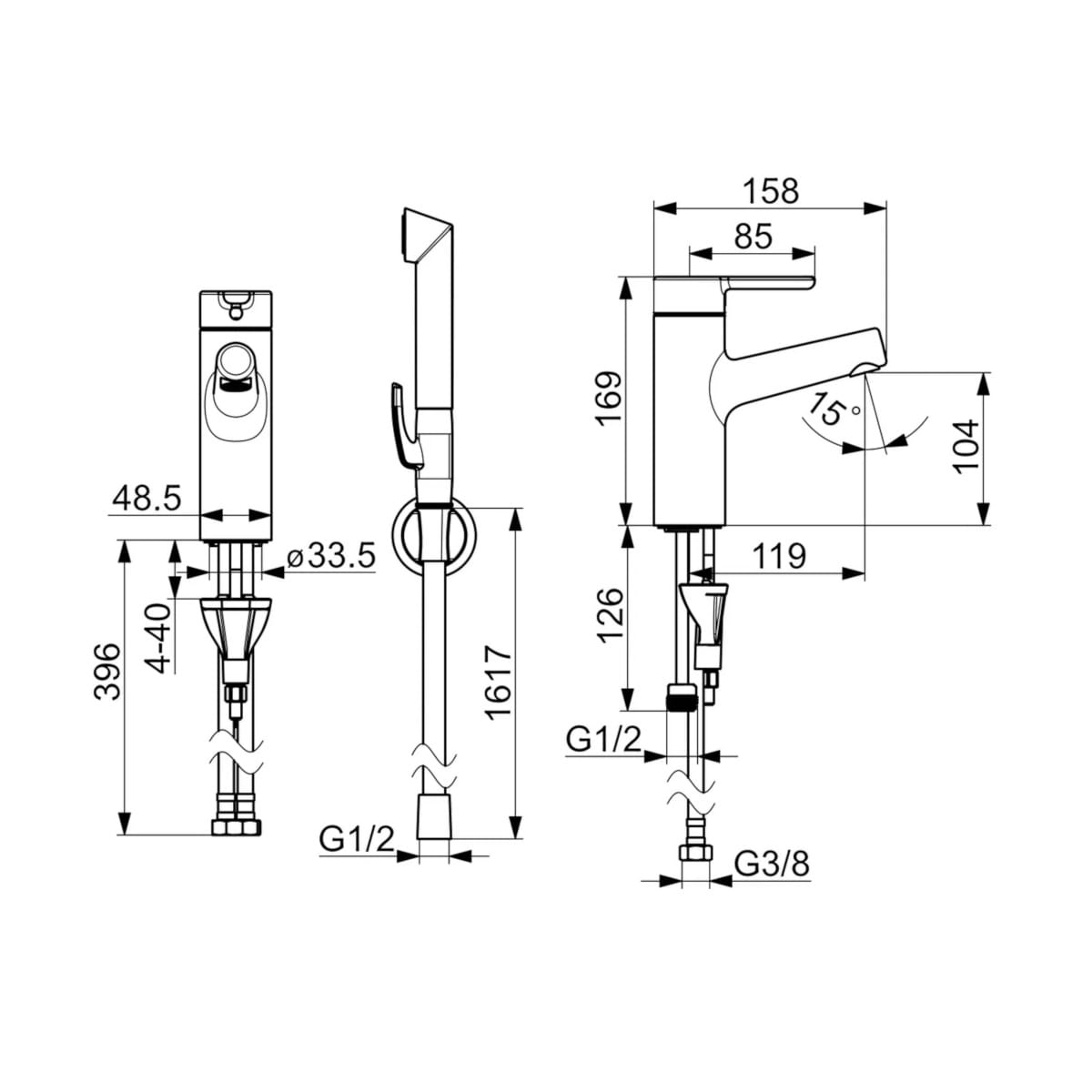 Dane techniczne: - wysokość baterii: 169 mm - długość baterii: 158 mm - zasięg wylewki: 119 mm - wąż natrysku: 1600 mm - woda ciepła zasilająca max. +70°C - ceramiczna głowica 40 mm do ustawiania przepływu i temperatury