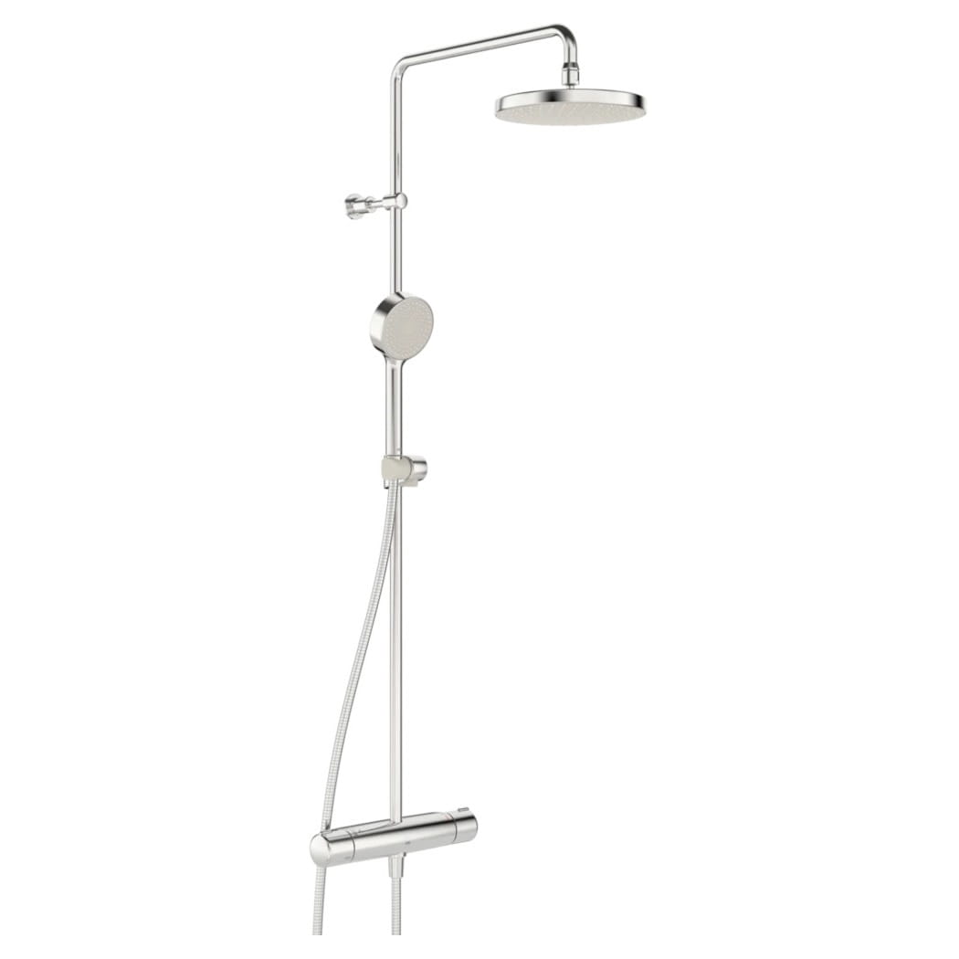 W komplecie znajdują się: bateria termostatyczna, drążek, wąż ze słuchawką, deszczownica oraz zaworki zwrotne i filtry siatkowe.