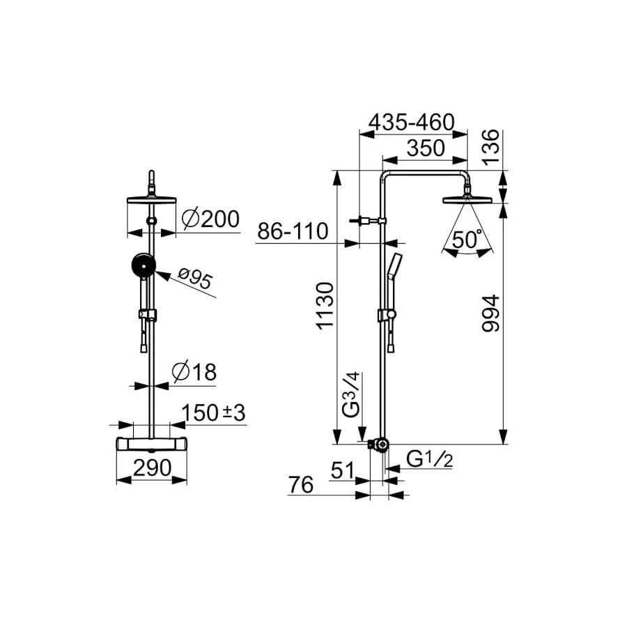 Dane techniczne: - przyłącze: G3/4 - średnica deszczownicy: 200 mm - ramię natrysku: 350 mm - wysokość drążka natrysku: 1130 mm - długość węża: 1750 mm - natężenie przepływu przy 300 kPa: 0.15 l/s