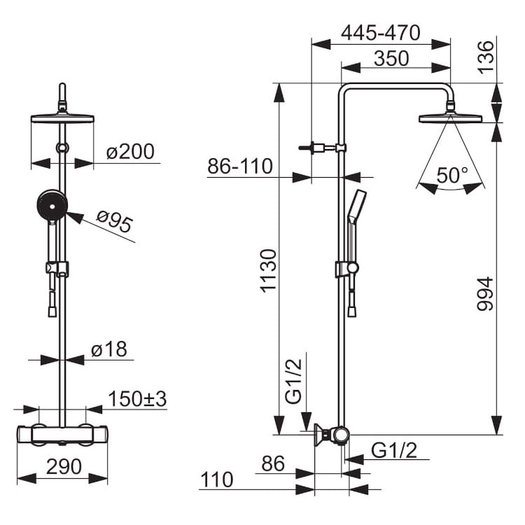 Dane techniczne: - wielkość przyłącza: G1/2 - wąż natryskowy: 1750 mm - długość drążka: 1130 mm - średnica deszczownicy: 200 mm - średnica słuchawki: 95 mm