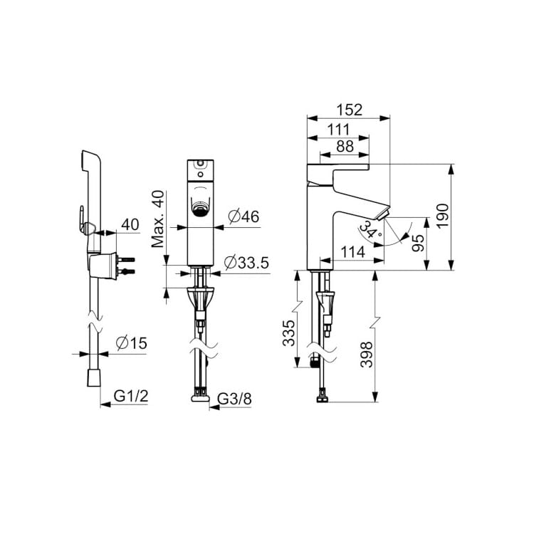 Dane techniczne: - głowica ceramiczna: 30 mm - zasięg wylewki: 114 mm - wysokość baterii: 190 mm - długość baterii: 152 mm - przepływ wody dla 300 kPa: 0.07 l/s