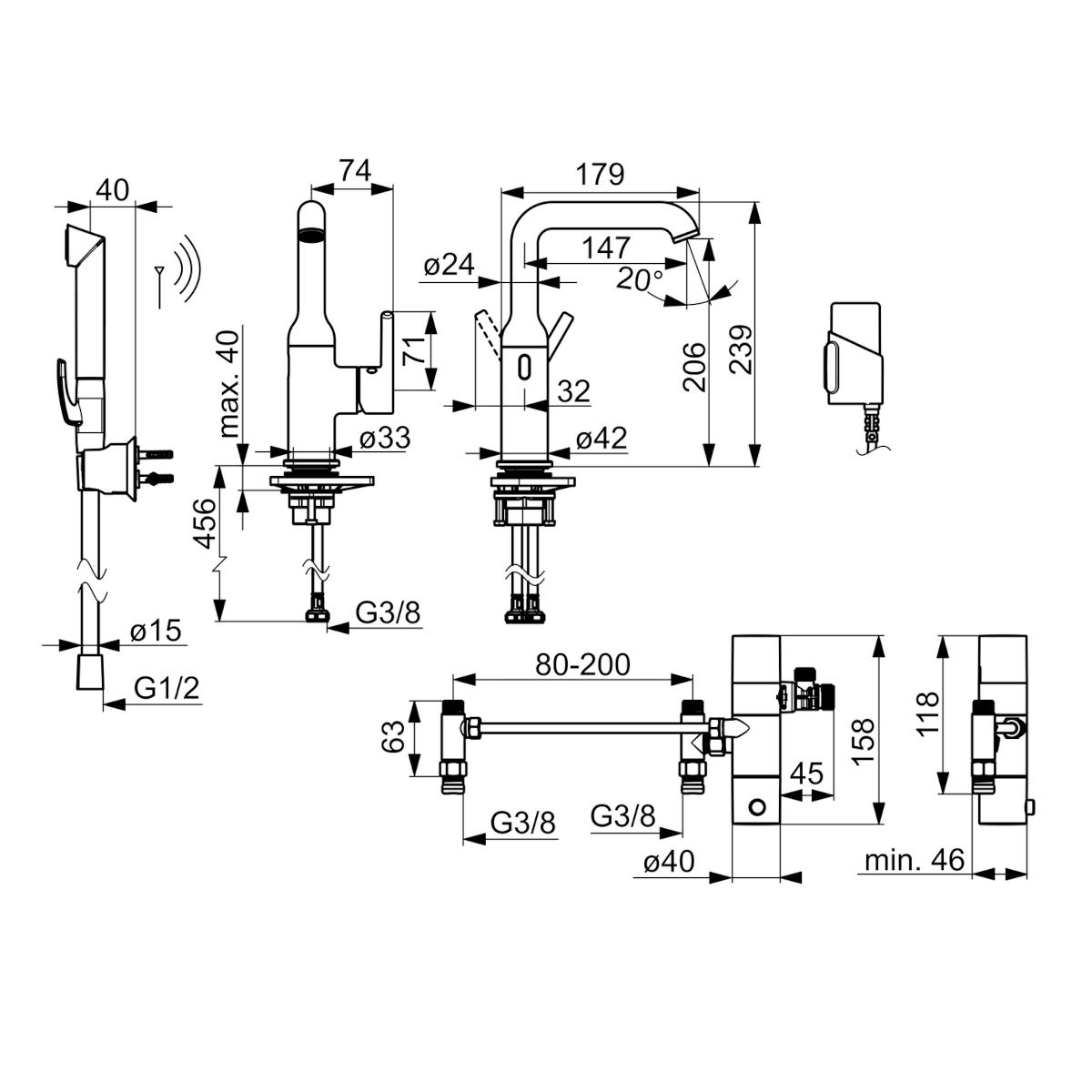 Dane techniczne: - wysokość baterii: 239 mm - zasięg wylewki: 147 mm - przyłącze: G 3/8 - długość węża: 1750 mm - natężenie przepływu przy 300 kPa (Z regulatorem): 0.1 l/s - spadek ciśnienia dla przepływu (0.1 l/s): 195 kPa
