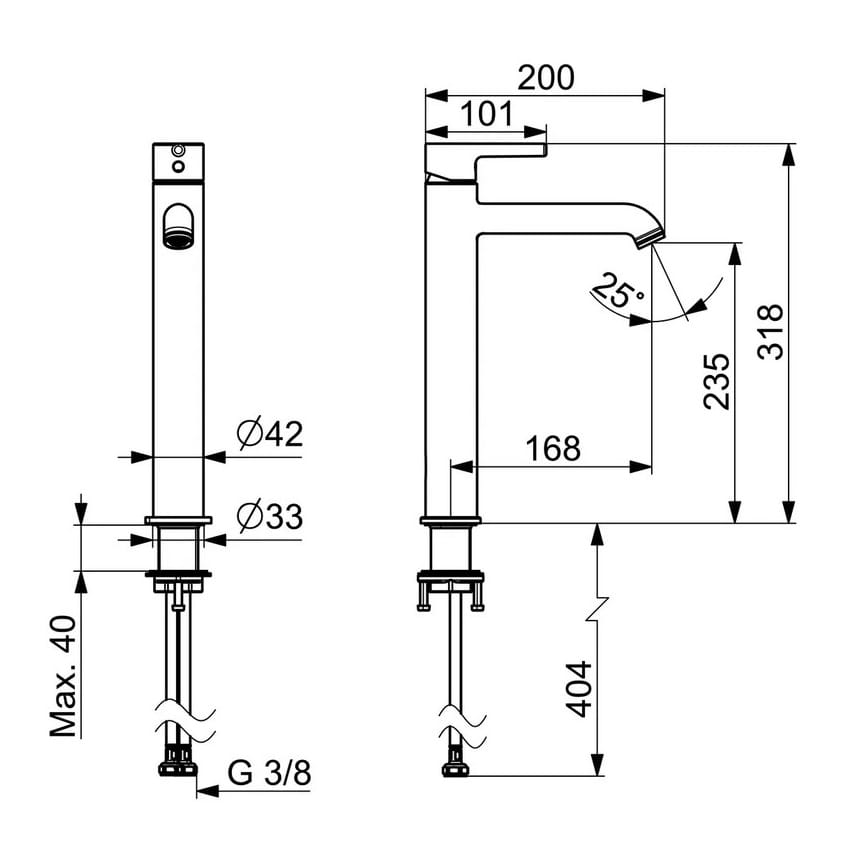 Dane techniczne: - wysokość baterii: 318 mm - długość baterii: 200 mm - zasięg wylewki: 168 mm - przyłącza: G3/8
