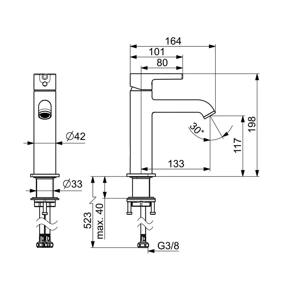 Dane techniczne: - wysokość baterii: 198 mm - długość baterii: 164 mm - zasięg wylewki: 133 mm - przyłącza G3/8