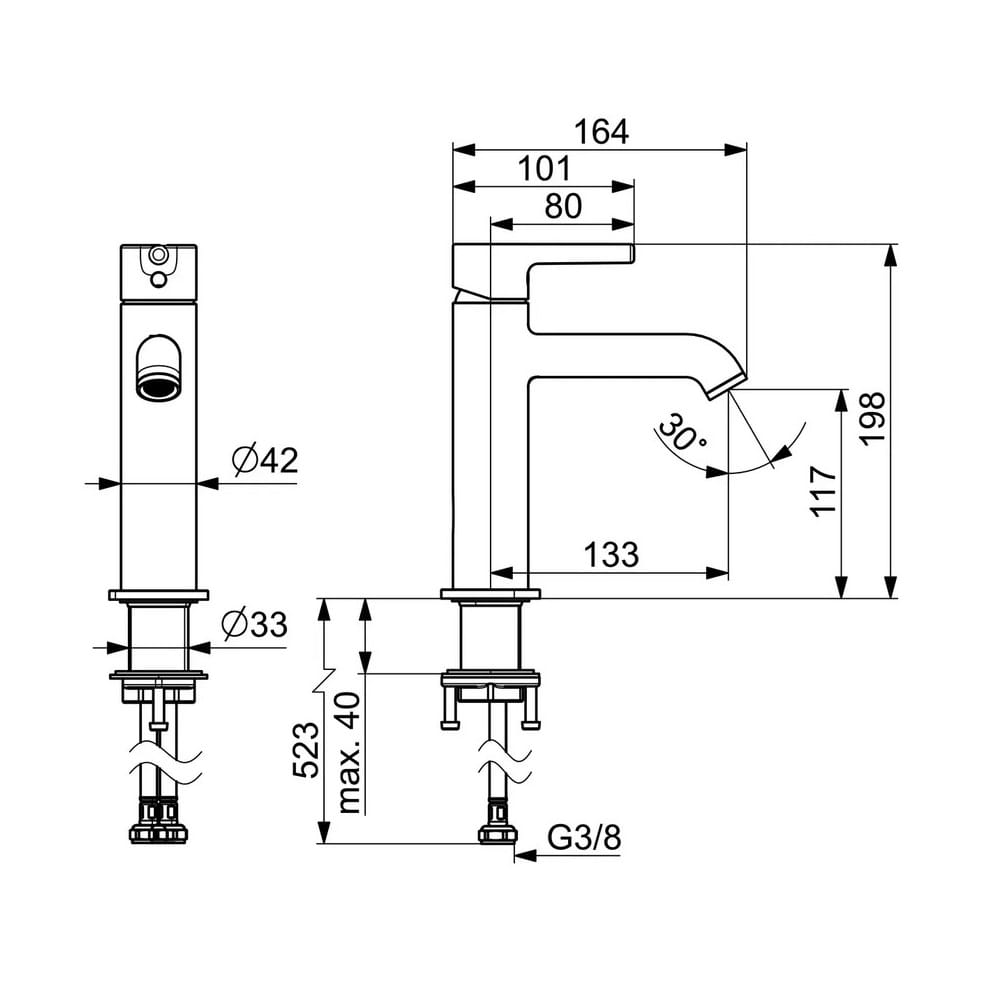 Dane techniczne: - wysokość baterii: 198 mm - długość baterii: 164 mm - zasięg wylewki: 133 mm - przyłącza G3/8