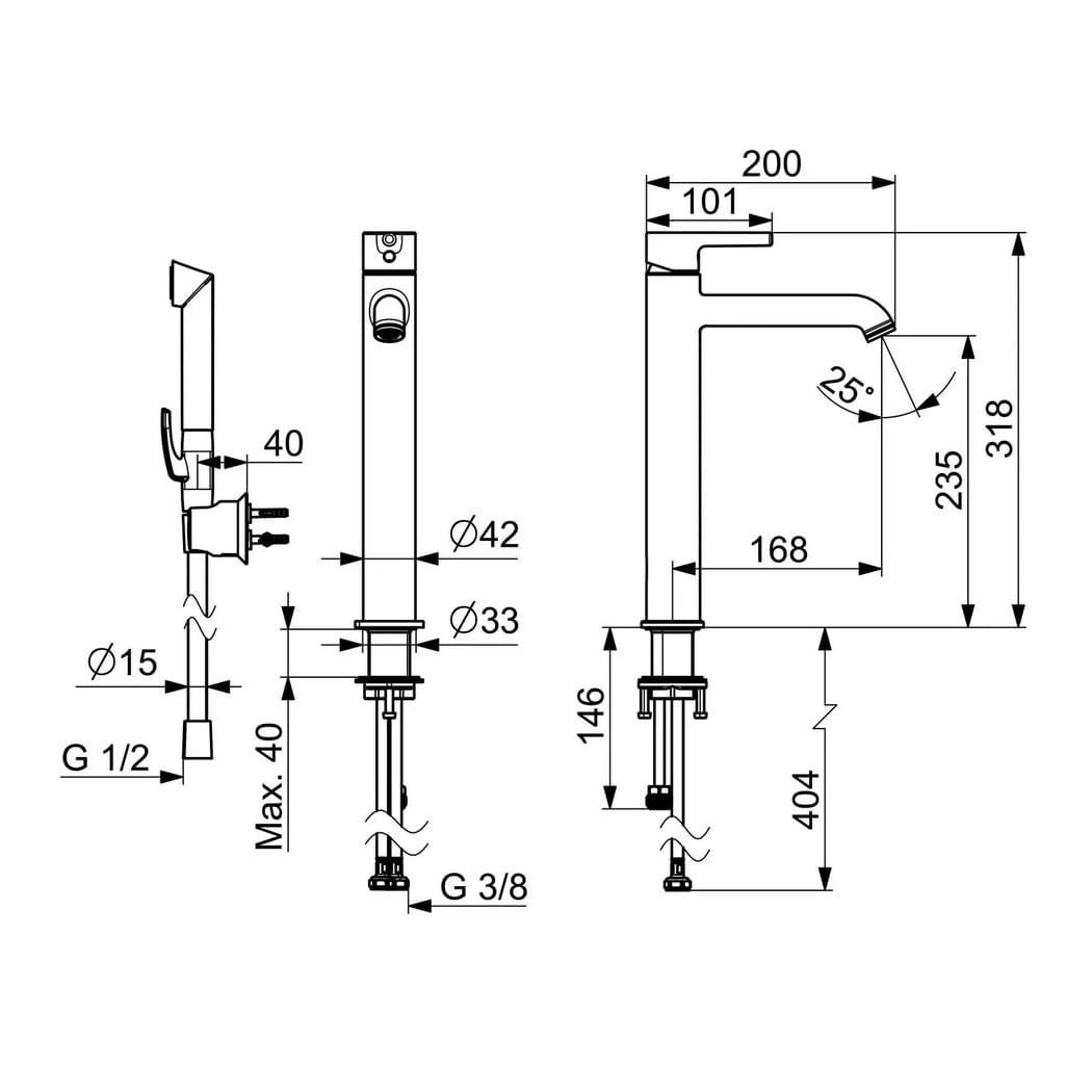 Dane techniczne: - wysokość baterii: 318 mm - długość baterii: 200 mm - zasięg wylewki: 168 mm - przyłącze: G 3/8