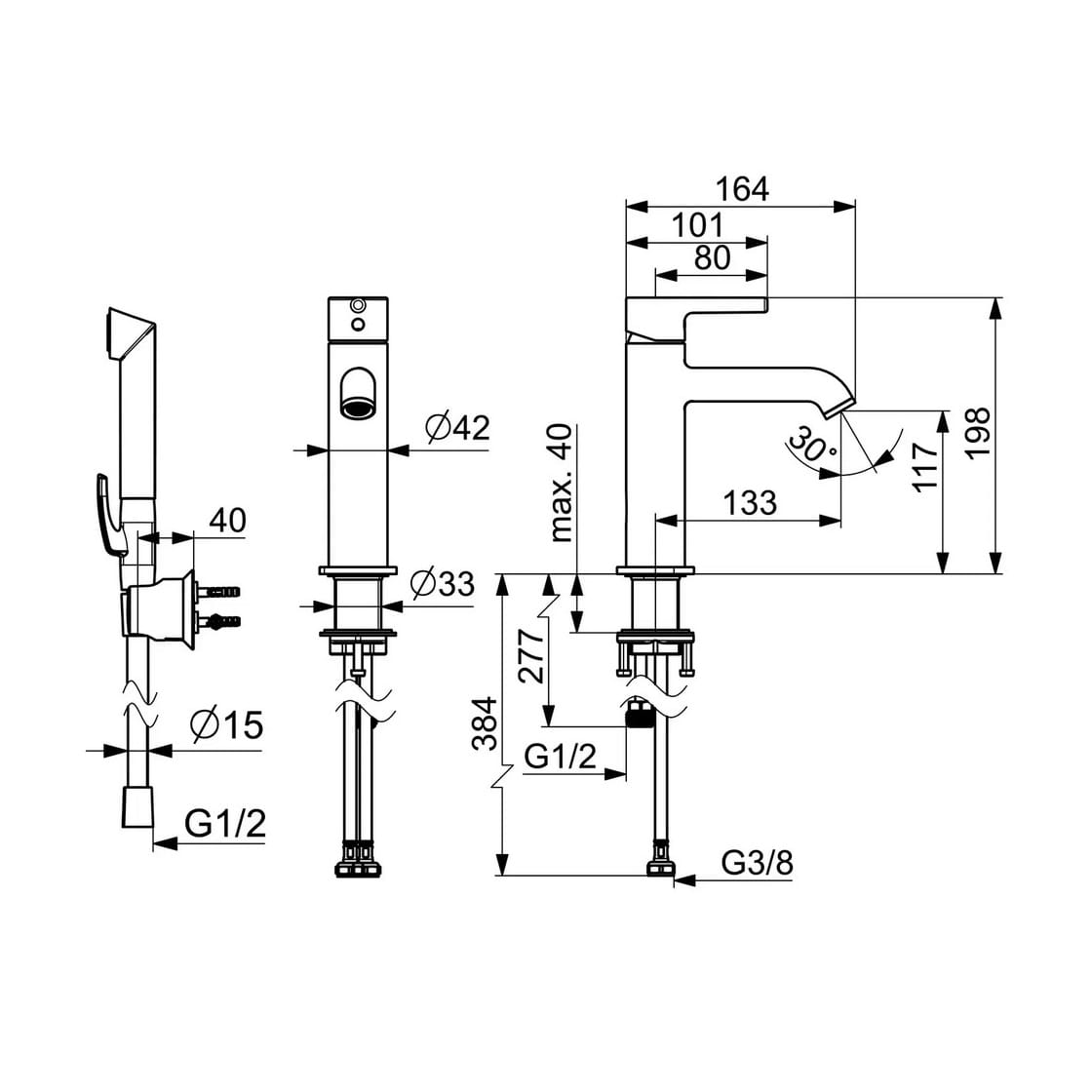 Dane techniczne: - wysokość baterii: 198 mm - długość baterii: 164 mm - zasięg wylewki: 133 mm - głowica ceramiczna: 30 mm - przepływ wody dla 300 kPa: 0.1 l/s
