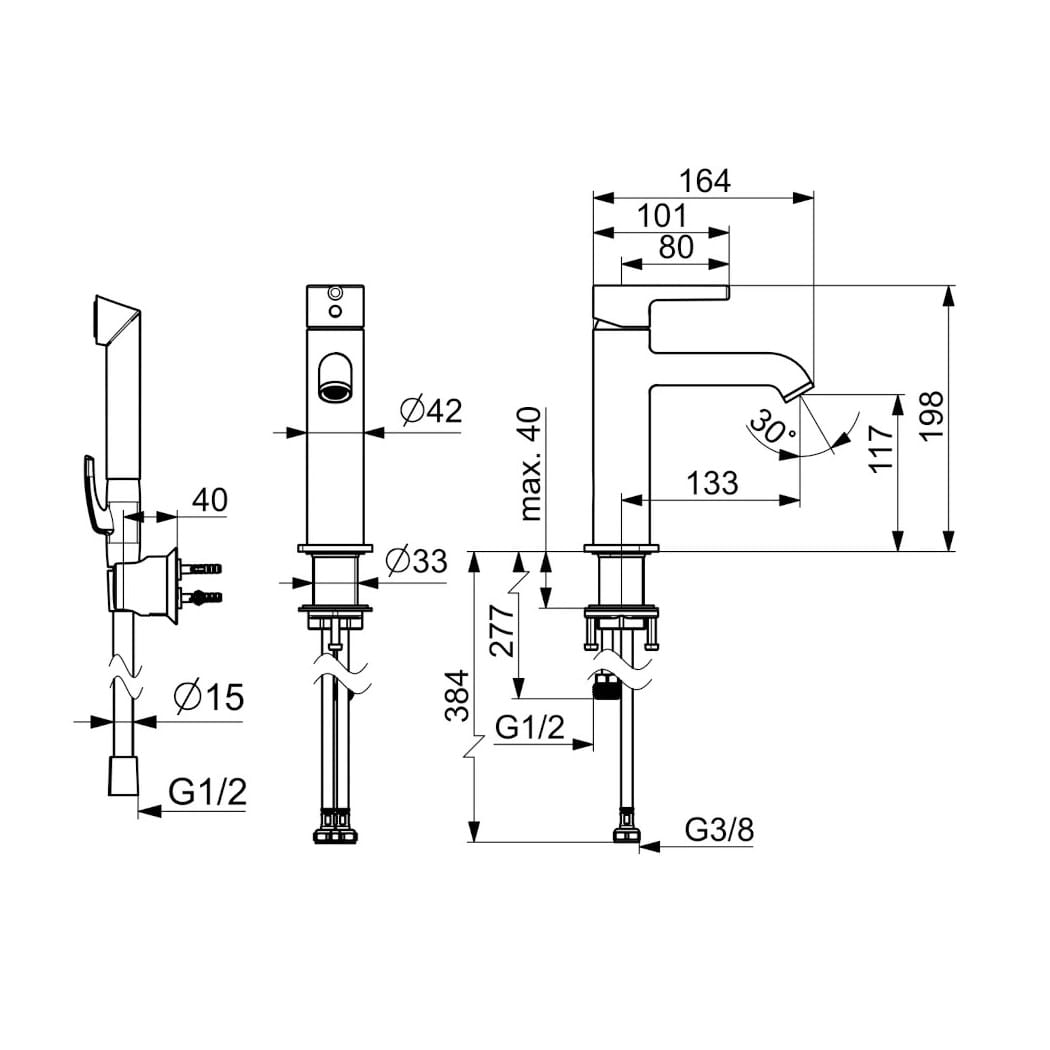 Dane techniczne: - głowica ceramiczna: 30 mm - zasięg wylewki: 133 mm - wysokość baterii: 198 mm - długość baterii: 164 mm - przepływ wody dla 300 kPa: 0.1 l/s
