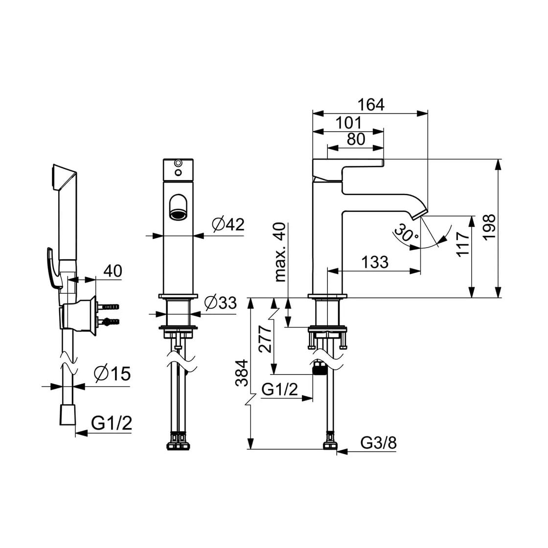 Dane techniczne: - wysokość baterii: 198 mm - długość baterii: 164 mm - zasięg wylewki: 133 mm - głowica ceramiczna: 30 mm - przepływ wody dla 300 kPa: 0.1 l/s