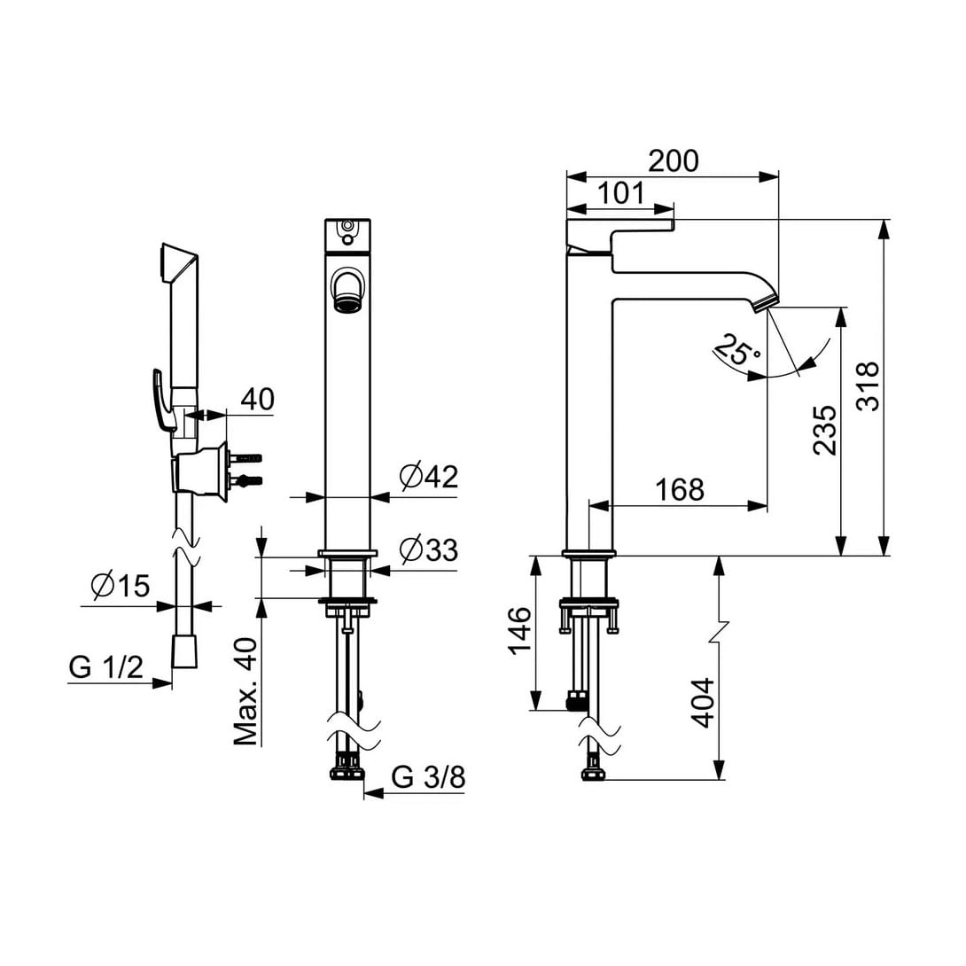 Dane techniczne: - wysokość baterii: 318 mm - długość baterii: 200 mm - zasięg wylewki: 168 mm - przyłącze: G 3/8