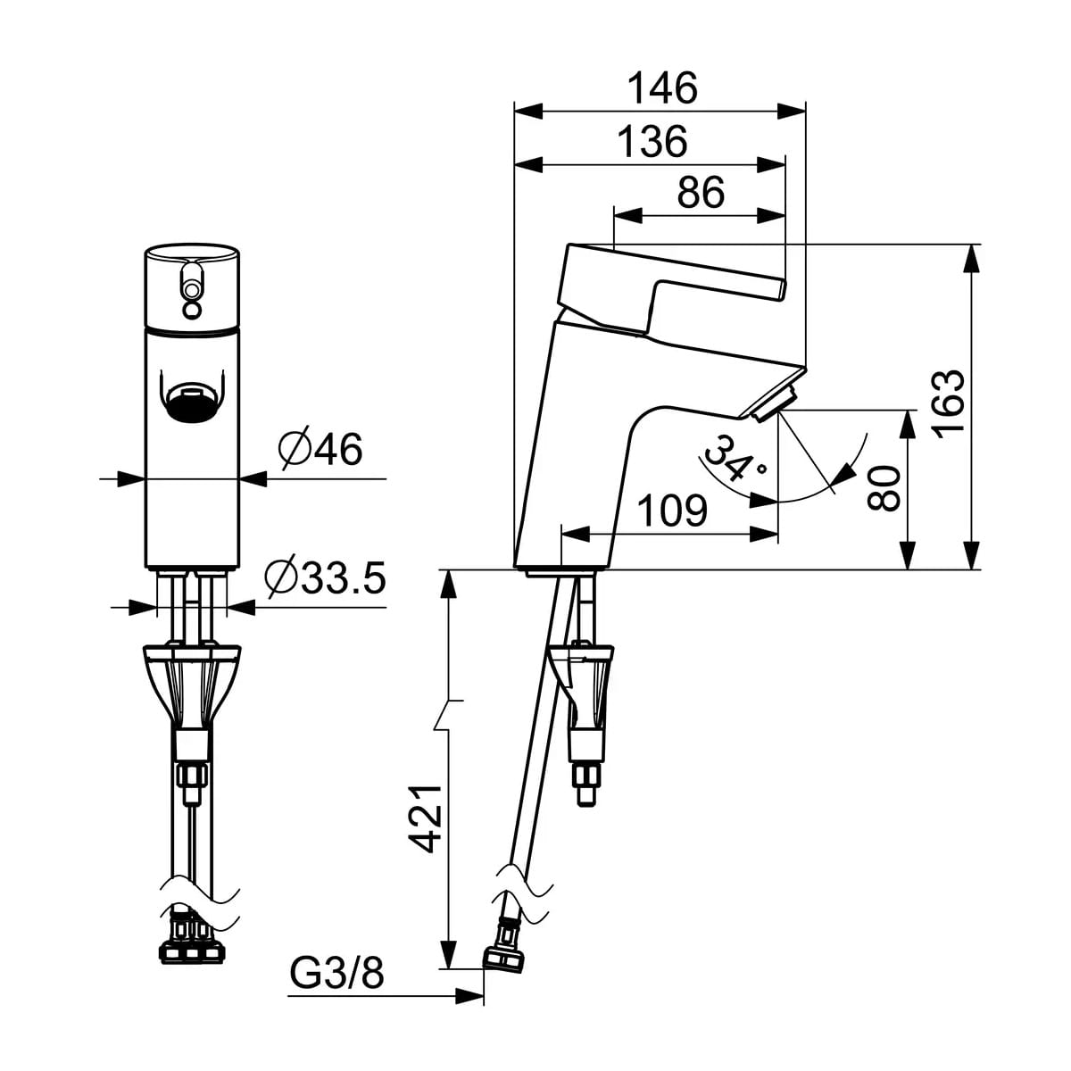 Dane techniczne: - wysokość baterii: 163 mm - długość baterii: 146 mm - zasięg wylewki: 109 mm - przyłącza G3/8