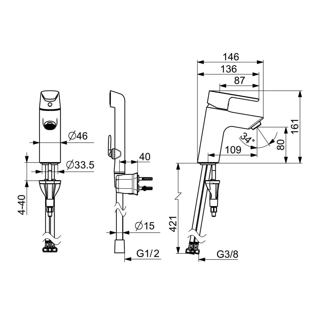 Dane techniczne: - wysokość baterii: 161 mm - długość baterii: 146 mm - zasięg wylewki: 109 mm - głowica ceramiczna: 30 mm - przepływ wody dla 300 kPa: 0.1 l/s