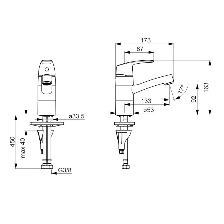 Dane techniczne: - głowica ceramiczna: 40 mm - zasięg wylewki: 133 mm - wysokość baterii: 163 mm - natężenie przepływu przy 300 kPa: 0.1 l/s - spadek ciśnienia dla przepływu (0.1 l/s): 200 kPa