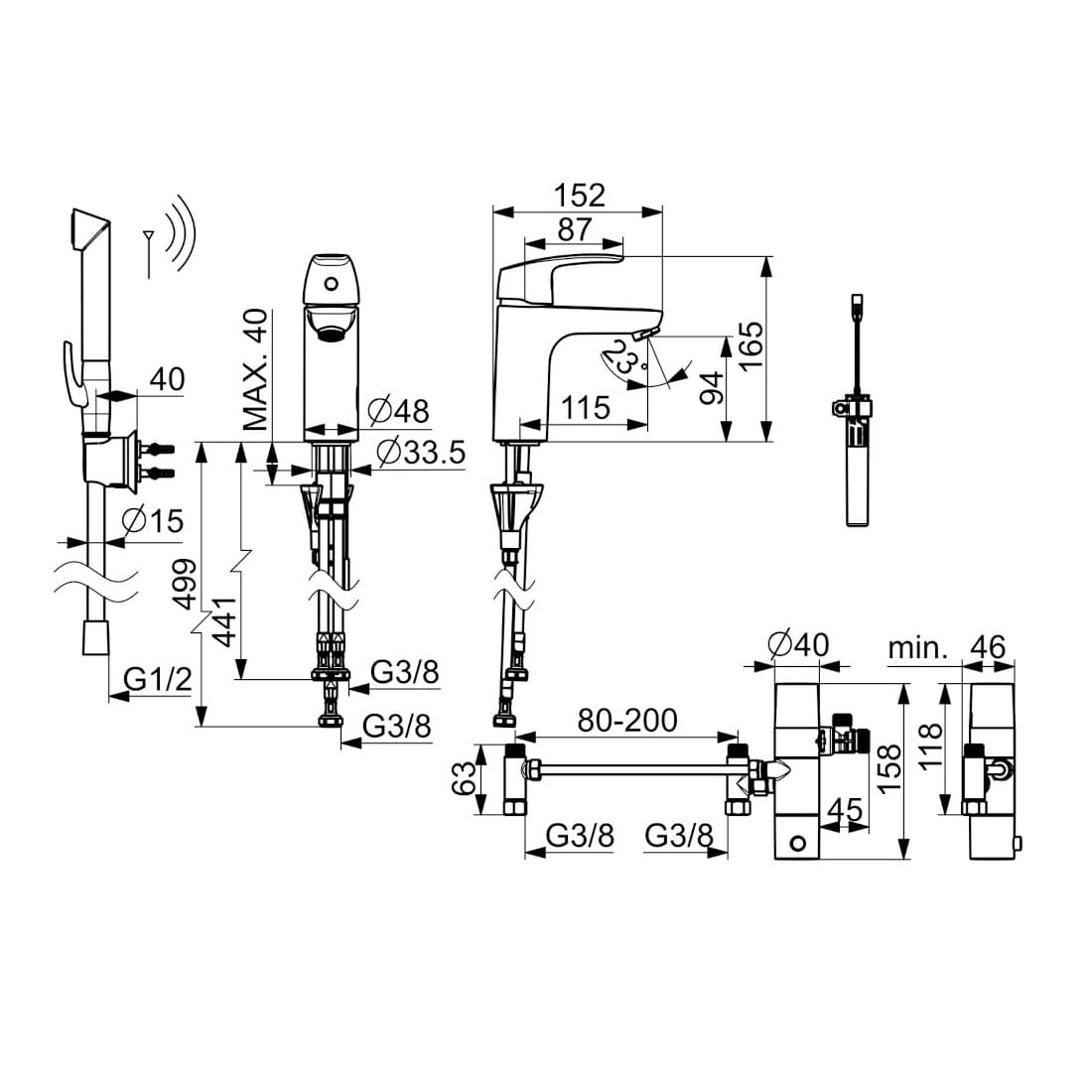 Dane techniczne: - głowica ceramiczna: 40 mm - zasięg wylewki: 115 mm - wysokość baterii: 165 mm - szerokość baterii: 152 mm - przepływ wody dla 300 kPa: 0.09 l/s - spadek ciśnienia dla przepływu (0.1 l/s)): 300 kPa - podłączenie elektryczne: 9 V