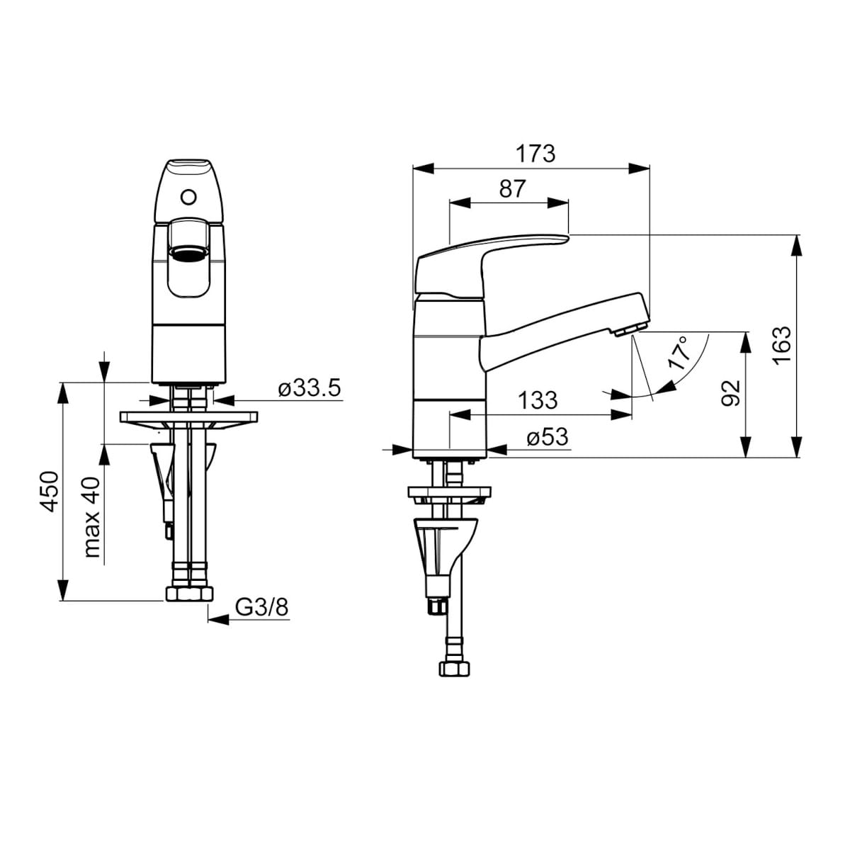 Dane techniczne: - głowica ceramiczna: 40 mm - zasięg wylewki: 133 mm - wysokość baterii: 163 mm - długość baterii: 173 mm - przepływ wody dla 300 kPa: 0.18 l/s - spadek ciśnienia dla przepływu (0.1 l/s): 95 kPa