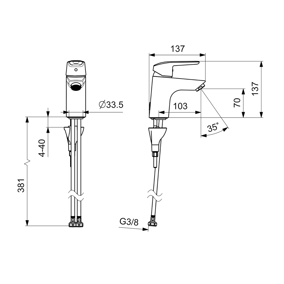 Dane techniczne: - wysokość baterii: 137 mm - zasięg wylewki: 103 mm - przyłącze: G 3/8 - natężenie przepływu przy 300 kPa (Z regulatorem): 0.07 l/s - natężenie przepływu przy 300 kPa w wersji Eko: 0.05 l/s