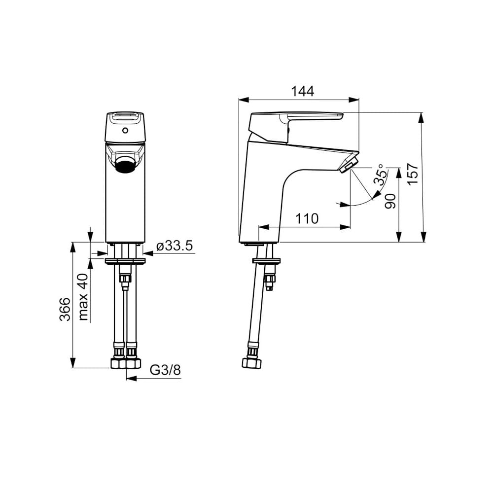 Dane techniczne: - głowica ceramiczna: 35 mm - zasięg wylewki: 110 mm - wysokość baterii: 157 mm - szerokość baterii: 144 mm - natężenie przepływu przy 300 kPa: 0.07 l/s