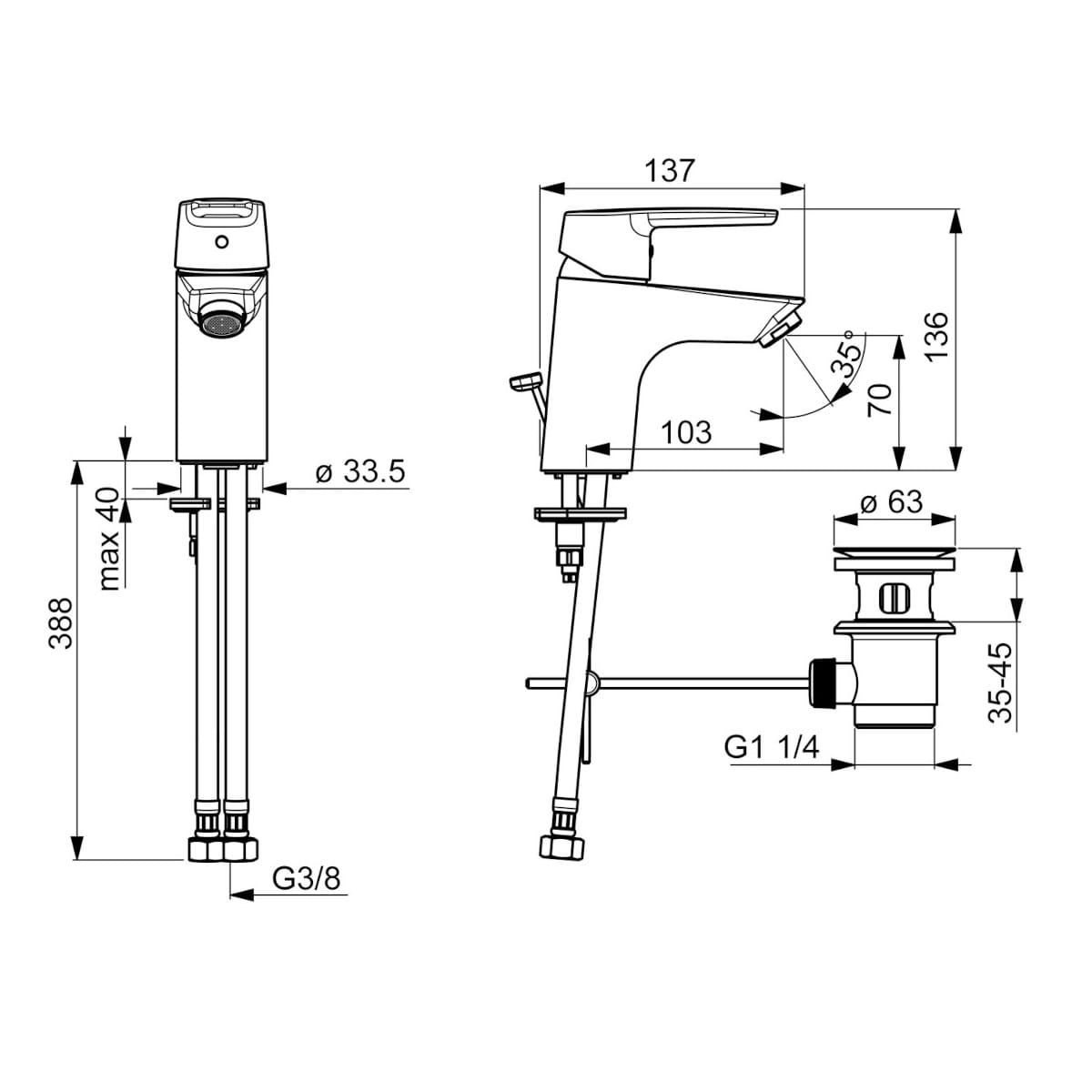 Dane techniczne: - głowica ceramiczna: 35 mm - zasięg wylewki: 103 mm - wysokość baterii: 136 mm - przepływ wody dla 300 kPa: 0.028 l/s
