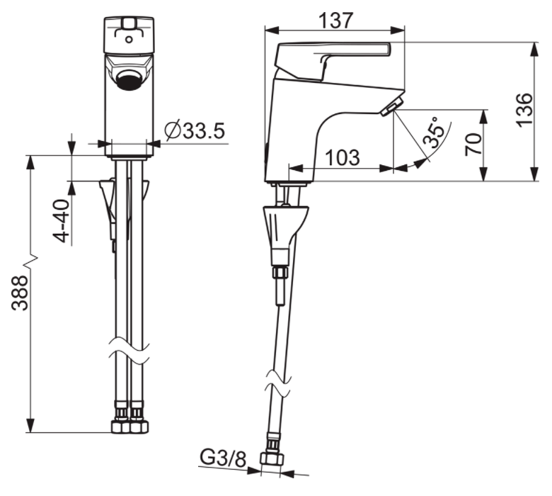 Dane techniczne: - przepływ wody: 6L/min - zasięg baterii: 103 mm - średnica przyłączy: 3/8" - wysokość baterii: 136 mm - ciśnienie robocze: 50-1000 kPa - woda ciepła zasilająca max: 70 stopni C