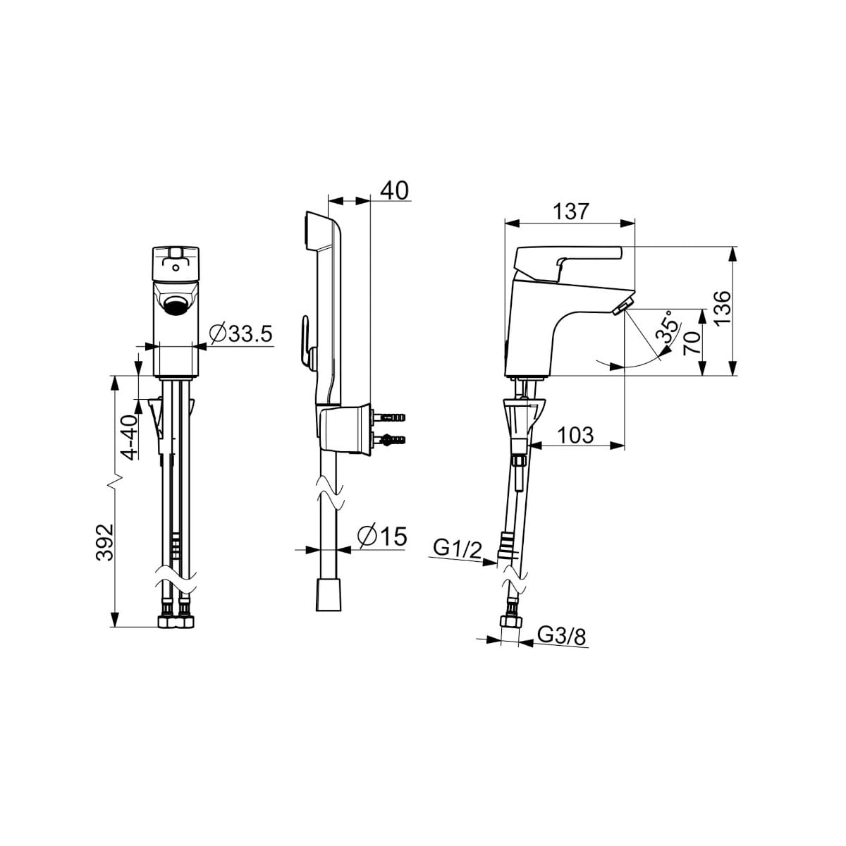 Dane techniczne: - głowica ceramiczna: 35 mm - zasięg wylewki: 103 mm - wysokość baterii: 136 mm - długość węża: 1500 mm - natężenie przepływu przy 300 kPa: 0.1 l/s