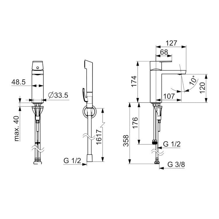 Dane techniczne: - przyłącze: G3/8 - zasięg wylewki: 107 mm - wysokość baterii: 174 mm - długośc węża: 1750 mm - natężenie przepływu przy 300 kPa: 0.07 l/s