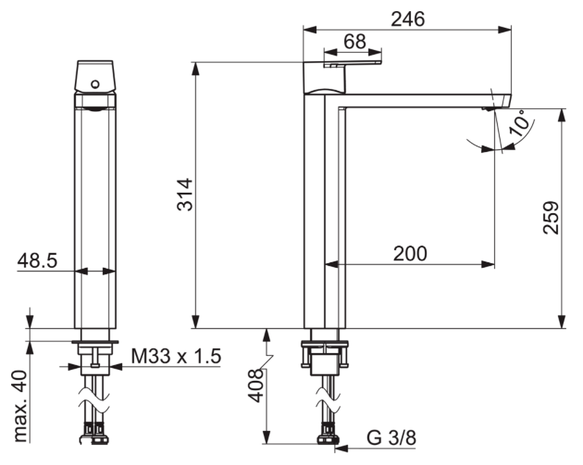 Dane techniczne: - przepływ wody: 0,07L/s - zasięg baterii: 200 mm - średnica głowicy: 40 mm - średnica przyłączy: 3/8" - wysokość baterii: 314 mm - ciśnienie robocze: 50-1000 kPa - woda ciepła zasilająca max: 70 stopni C